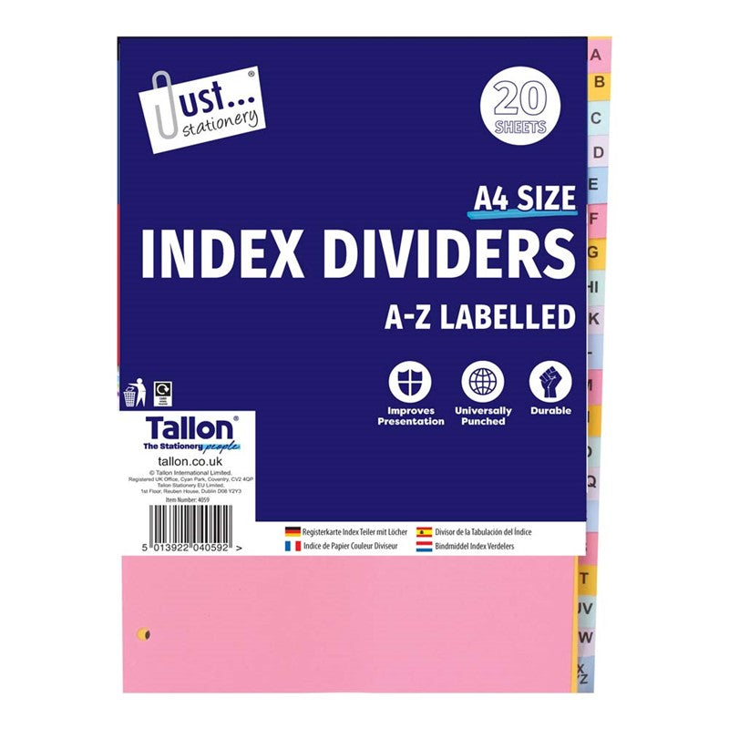 20 Coloured Card A-Z A4 Index Dividers
